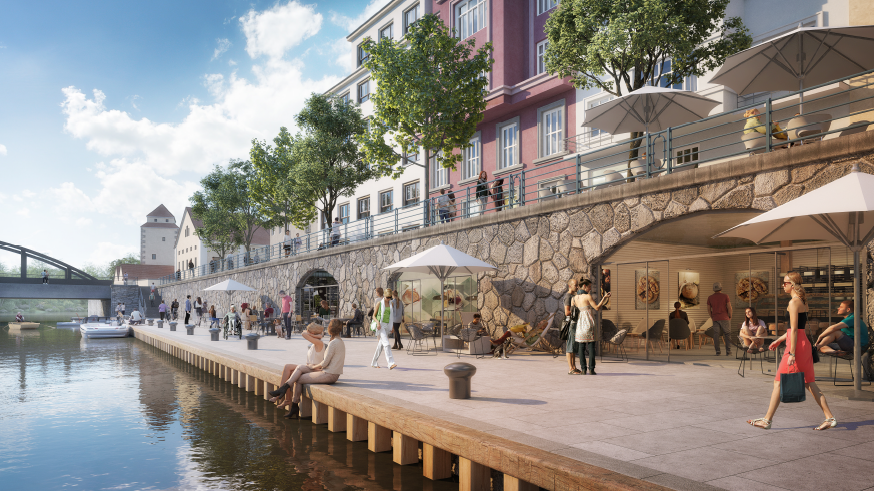 Vizualizace Zátkova nábřeží v centru Českých Budějovic.