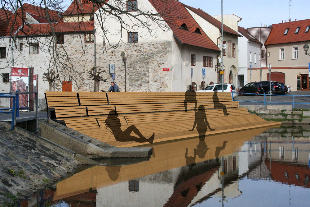 Vizualizace laviček nad vodou v centru Budějovic.