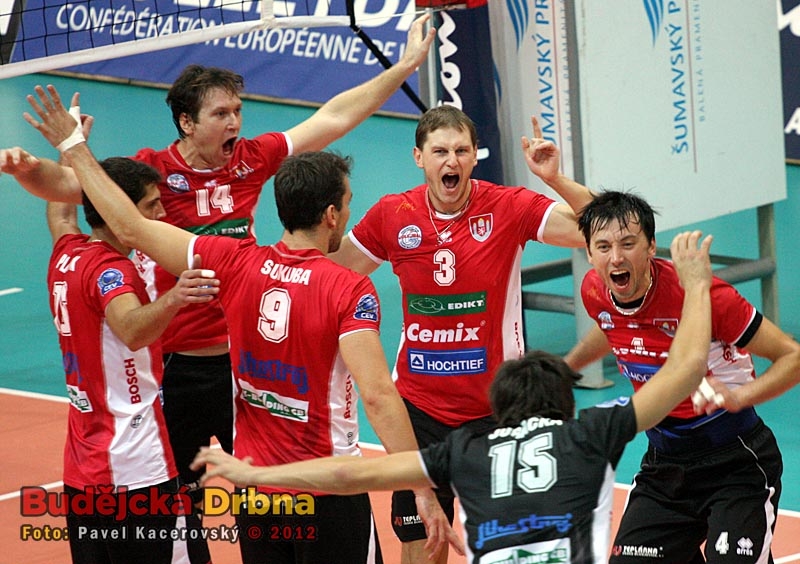 Radek Mach (č. 3) se společně se svými spoluhráči raduje z premiérového vítězství Jihostroje v Lize mistrů nad Budvou. V Černé Hoře však Budějčáci tamnímu mistrovi podlehli