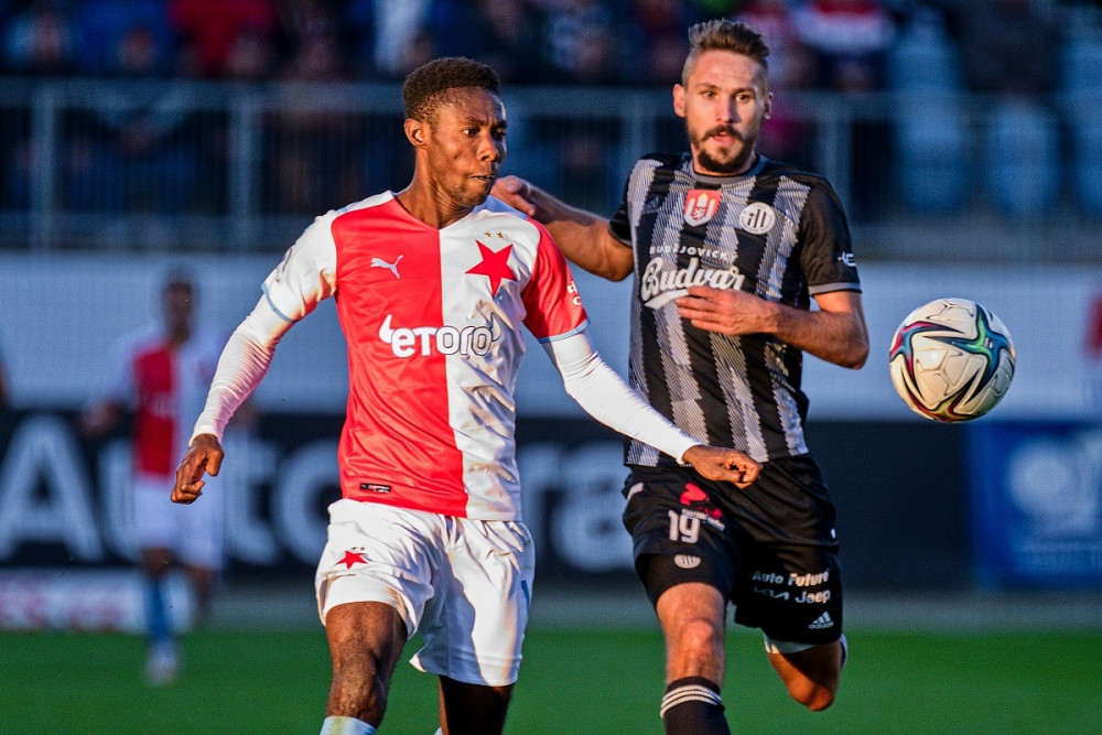 Patrik Brandner (v černém) vstřelil úvodní gól proti Slavii. Zápas skončil 2:2.