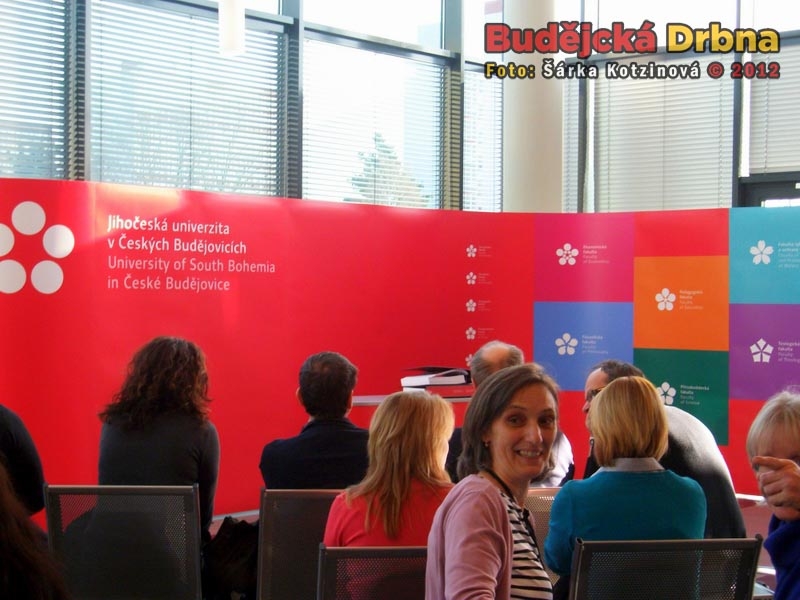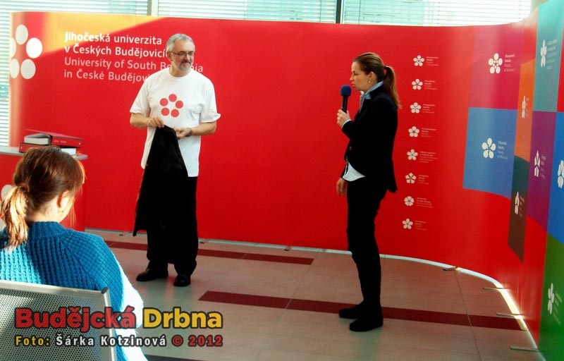 Grafička Radka Folprechtová a rektor Libor Grubhoffer představují nové logo Jihočeské univerzity