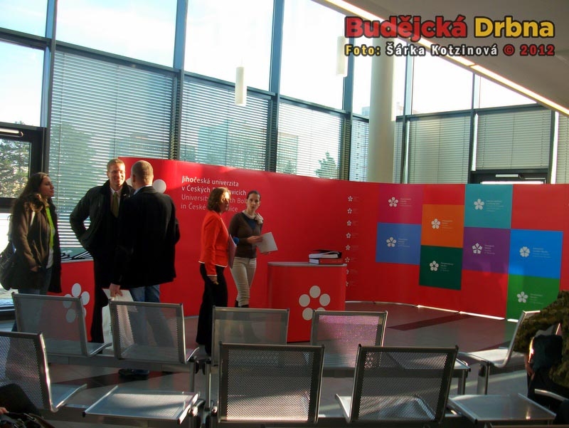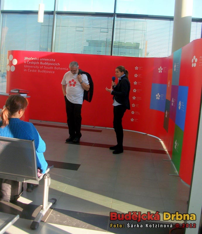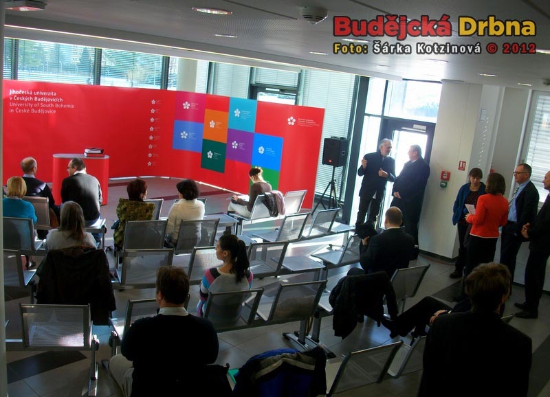 Grafička Radka Folprechtová a rektor Libor Grubhoffer představují nové logo Jihočeské univerzity