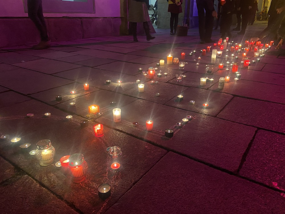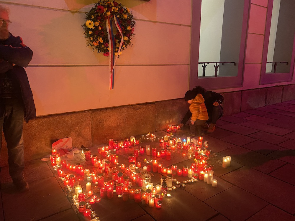 Ze střechy radnice zazněla česká hymna. Lidé na náměstí zapalovali svíčky