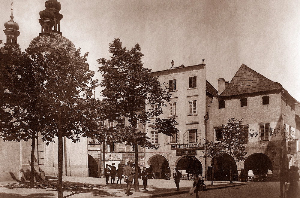 Klasicistní dům s vysokou atikou v Kněžské 12, rodný dům legendy Národního divaldala Eduarda Kohoura.