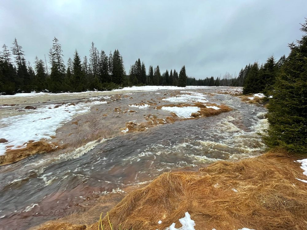 Potok pod silnicí na Rybárně. Loni národní park díky projektu LIFE for MIRES pustil vodu z rovné strouhy zpět do původního koryta. A funguje dobře - rozlévá se.