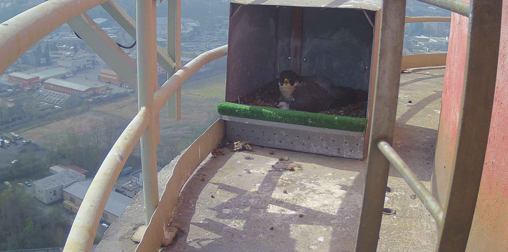 Teplárenský komín obývají čtyři sokolí mláďata. Lidé je mohou sledovat živě