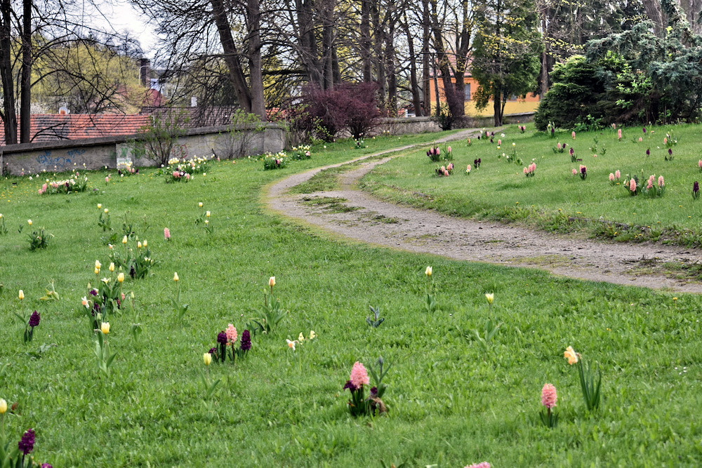 Starý hřbitov se proměnil v jarní louku. Kytky na podzim vysázely děti ze základní školy