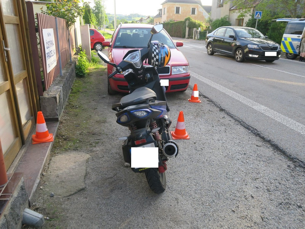 Opilý muž na skútru přejel do protisměru. Poškodil dvě auta a hlavou narazil do dveří