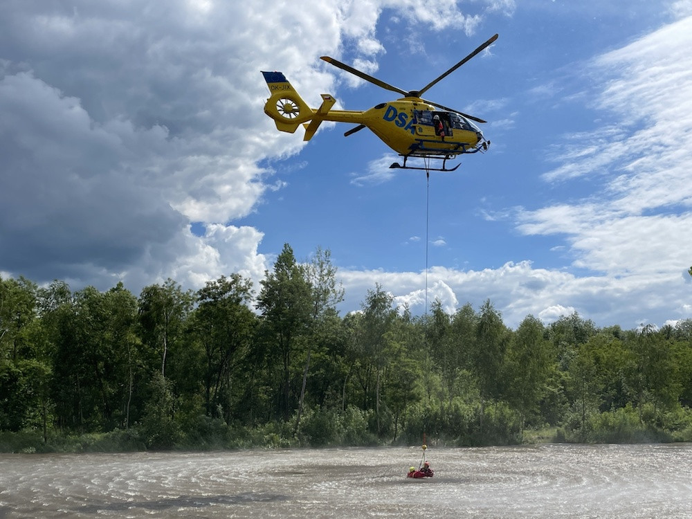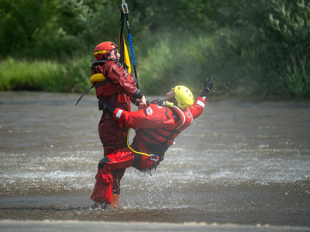 Letečtí záchranáři cvičili evakuaci z vodní hladiny. Náročný zásah probíhal v Plané