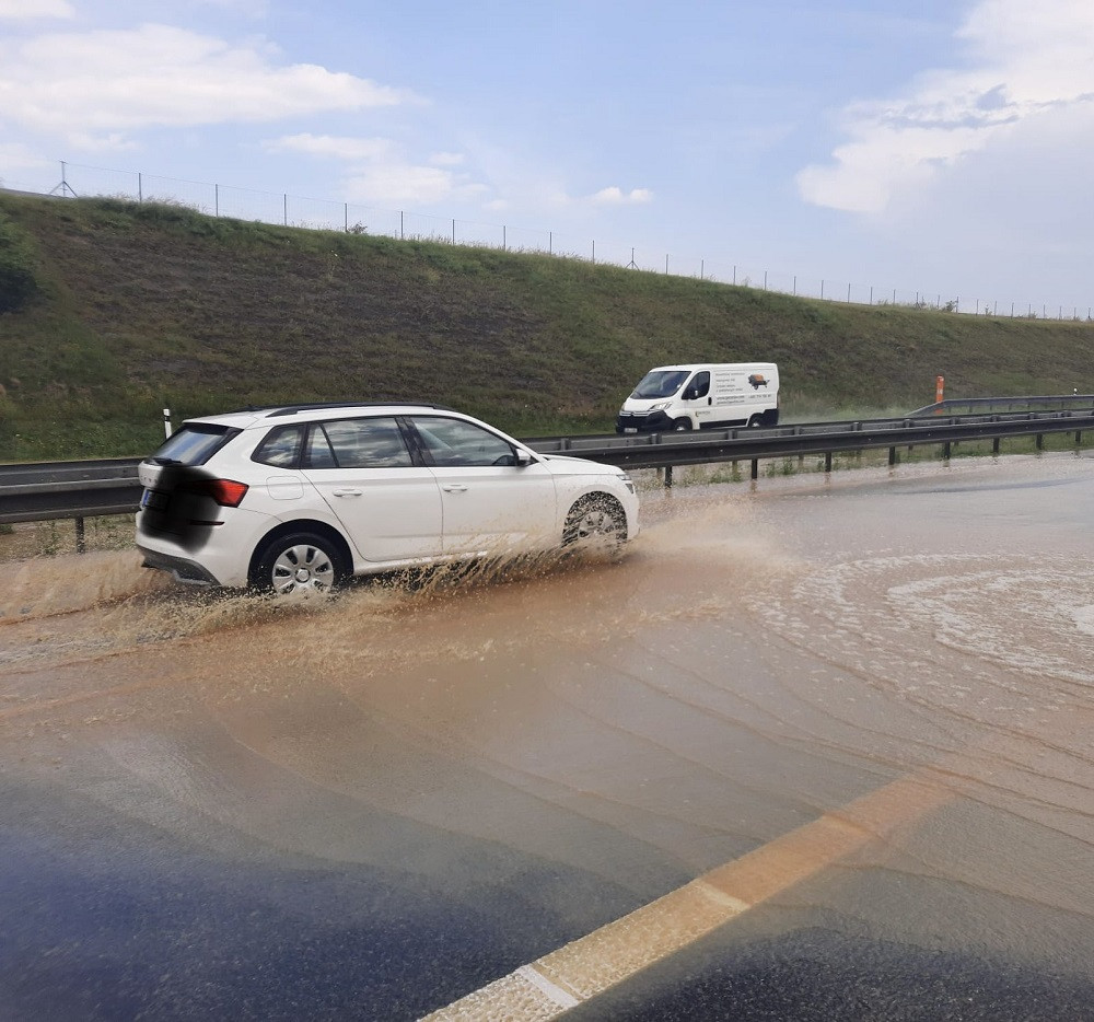 Jezero na dálnici. Na D3 se po sesuvu půdy rozlila voda do všech pruhů, řidiči musí zpomalit