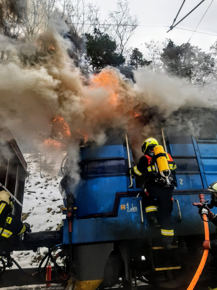 Hasiči zasahují u požáru lokomotivy. Provoz na železnici u Budějc je zastavený