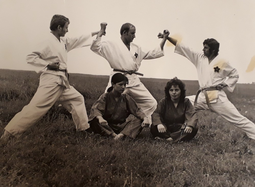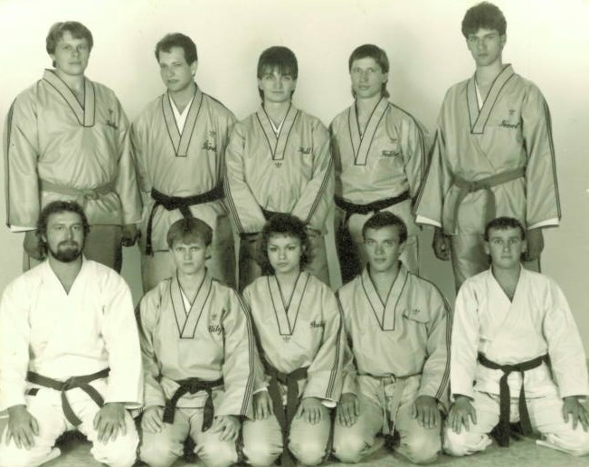 TJ Karate ČB rok 1985, zleva nahoře: Jan Kaňka, Milan Šírek, František Hakl, Jiří Faktor, Jiří Fencl, zleva dole: Jiří Bidlo, Stanislav Bílý, Dana Pouzarová, Jiří Halada, Jan Barát