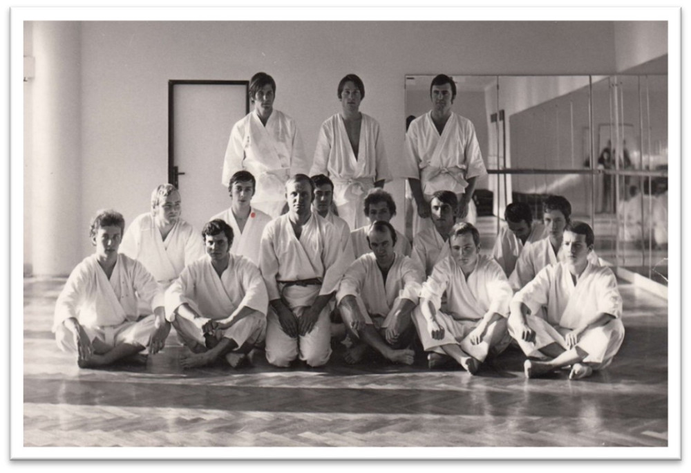 první tréninková skupina karate v ČB, uprostřed p. Hlaváček se svými svěřenci