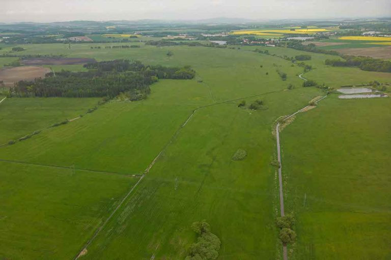 Na leteckém snímku Zbudovských Blat je dosud patrné, kudy meandroval Bezdrevský potok (střed snímku) než ho regulovali do rovného koryta vpravo. ČSO chce v budoucnu původní koryto obnovit.