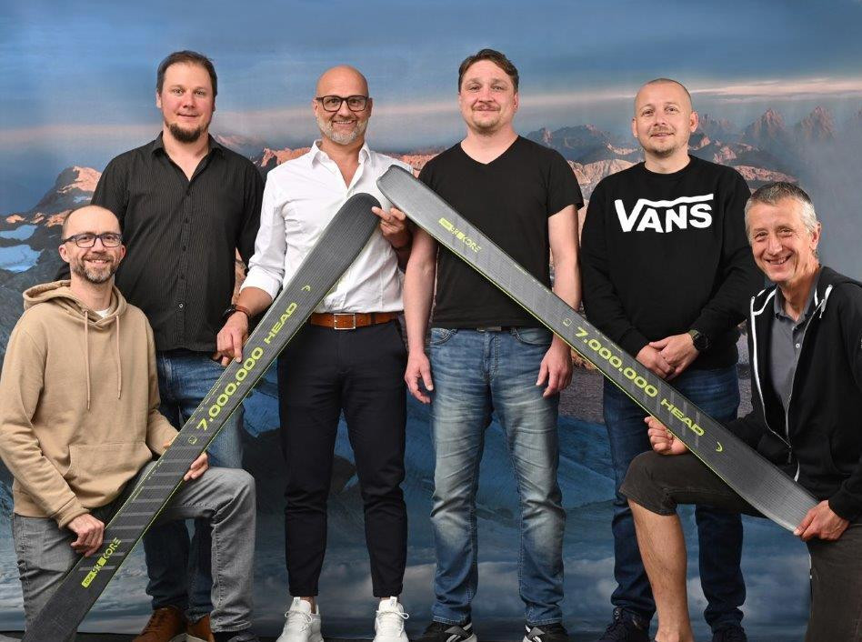 Head před nedávnem oslavil pár lyží s číslem 7 000 000. Třetí zleva v bílé košili je prokurista Robert Brugger se svým týmem.