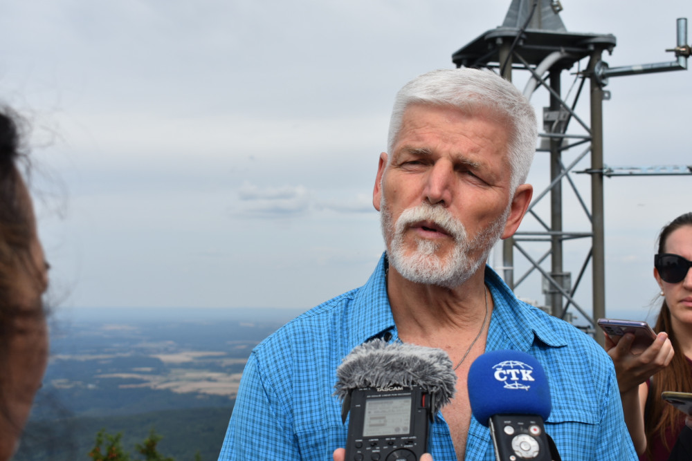 Prezident Petr Pavel mluvil s novináři na rozhledně vrcholu Kleť. Foto: Jakub Bartoš
