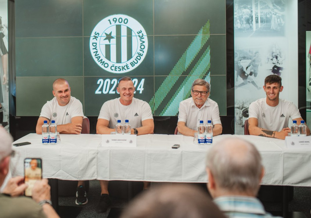 Tisková konference Dynama. Zleva: trenéři Marek Nikl a Tomáš Zápotočný, majitel klubu Vladimír Koubek, kapitán A-týmu Lukáš Havel.