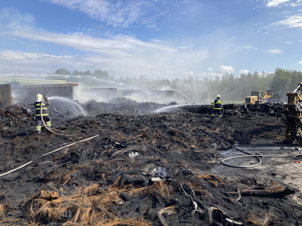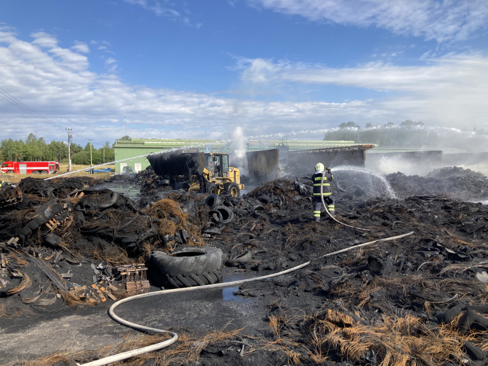 Zásah hasičů v Borovanech, kde začala hořet skládka pneumatik, pokračuje