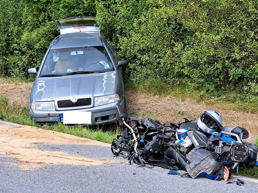 Na Českokrumlovsku se srazila motorka s osobním autem. Dva lidé zemřeli