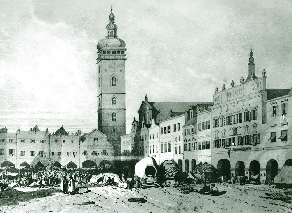 Na obrázku severovýchodního koutu náměstí z poloviny 19. století je asi hlavně zachycen trh, ale současně dobře Černá věž a hotel U Tří kohoutů vpravo.