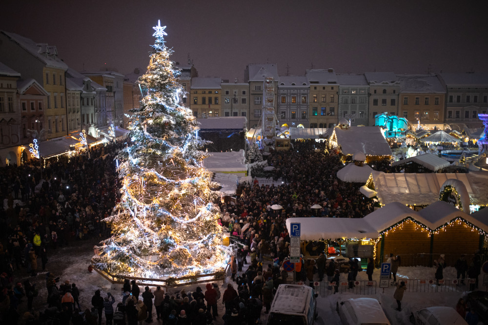 Na budějckém náměstí rozsvítili osmnáct metrů vysokou jedli