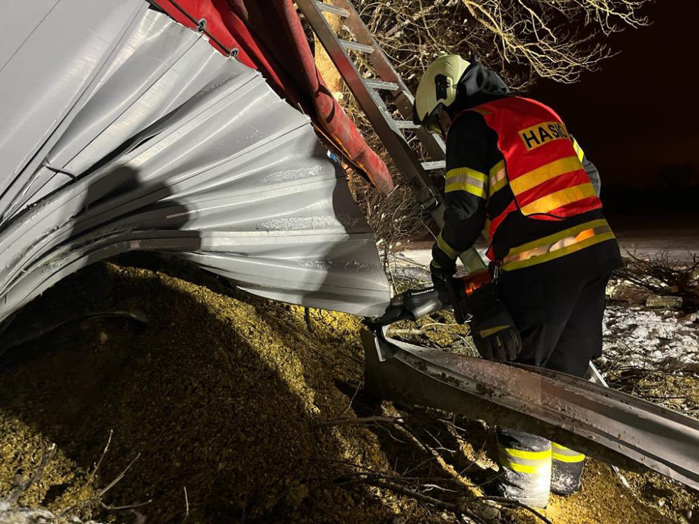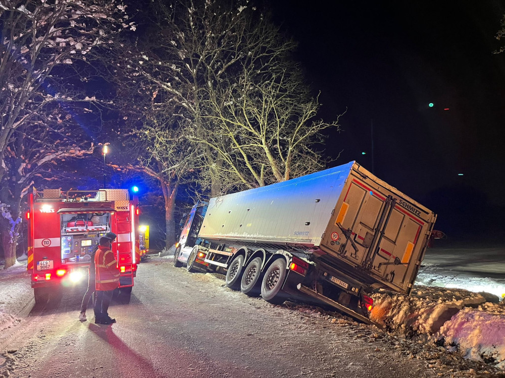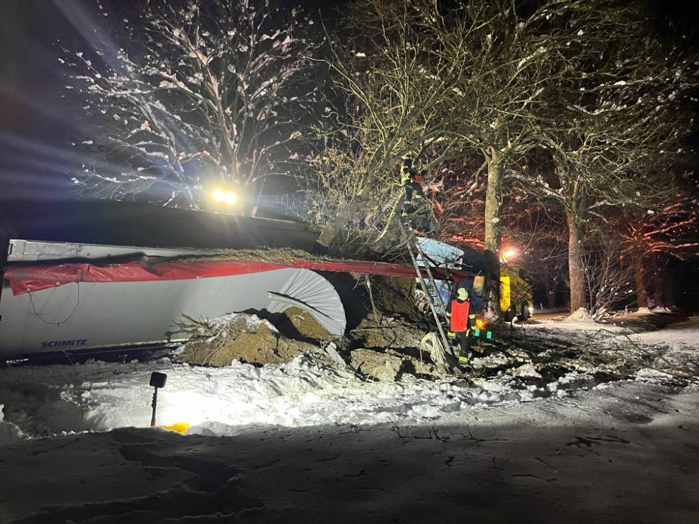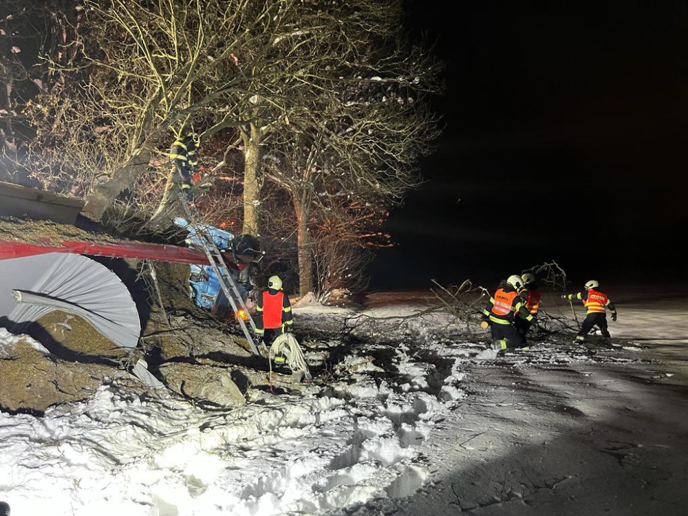 Kamion s návěsem skončil u Českých Budějovic ve škarpě a zaklíněný ve stromu