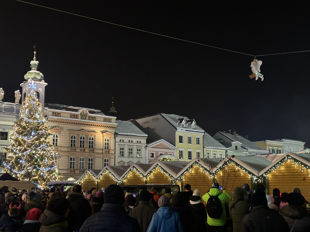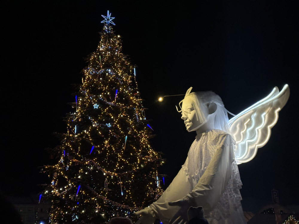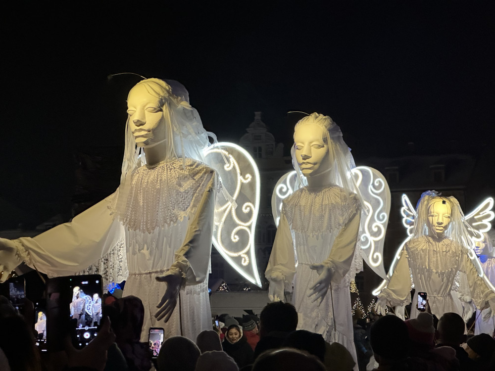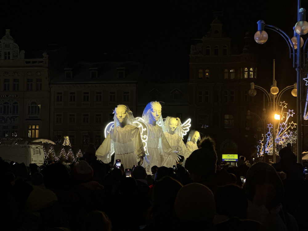 Z nasvícené Černé věže se snesl anděl. Na zemi ho doprovodilo pět obřích loutek