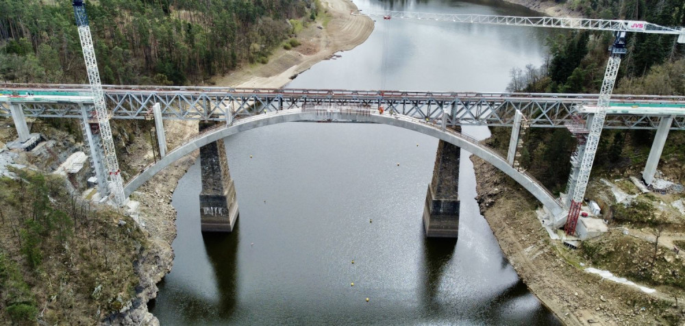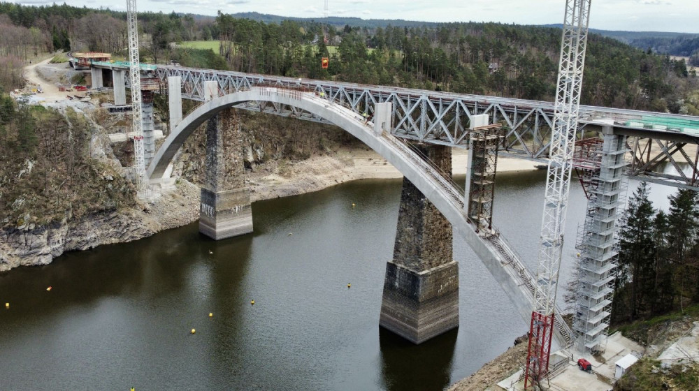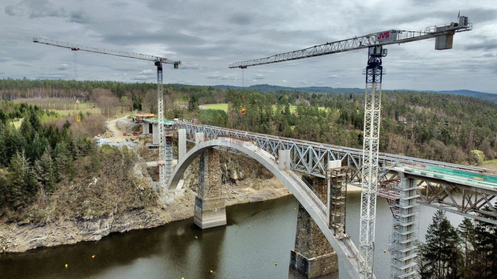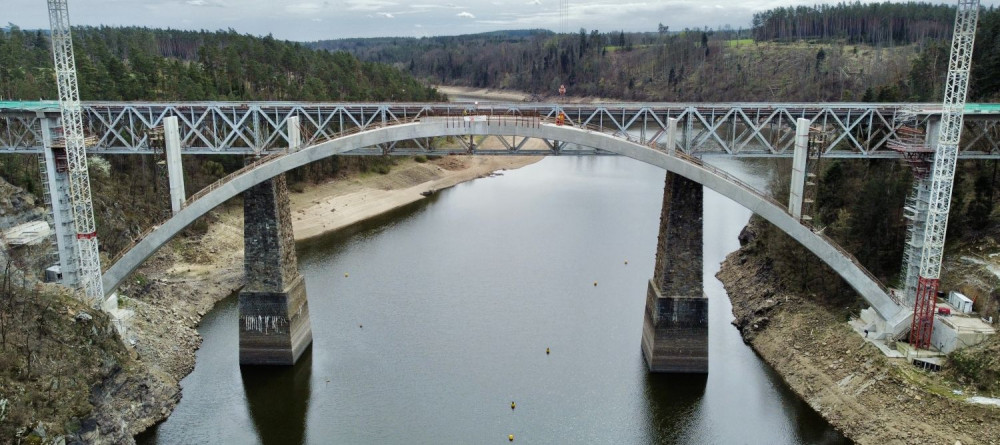 Stavbaři vybetonovali pilíře nad obloukem nového železničního mostu přes Orlík