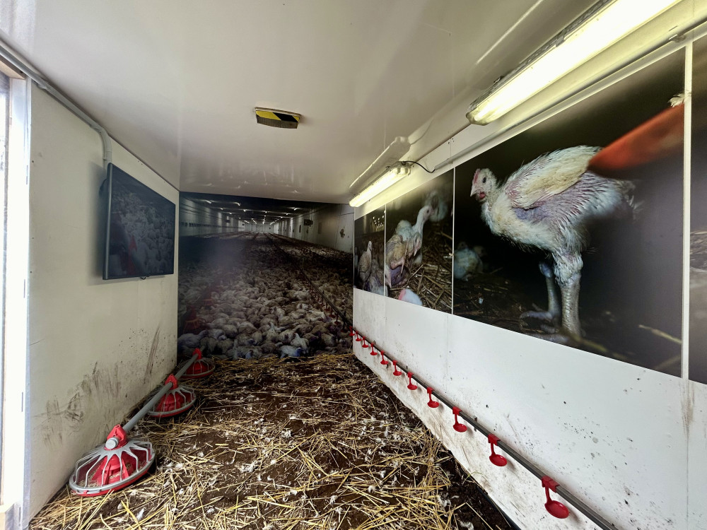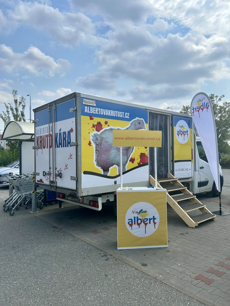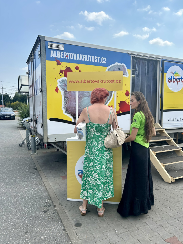 Obránci zvířat upozorňovali na problematický chov kuřat. S „krutokárou“ zastavili i v Budějcích