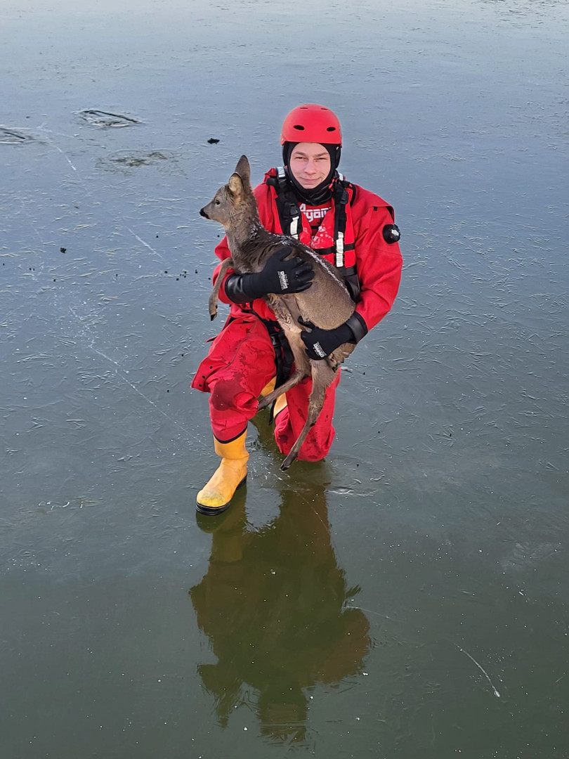 Hasiči zachránili srnu, která se u Pluhova Žďáru propadla do zamrzlého rybníka