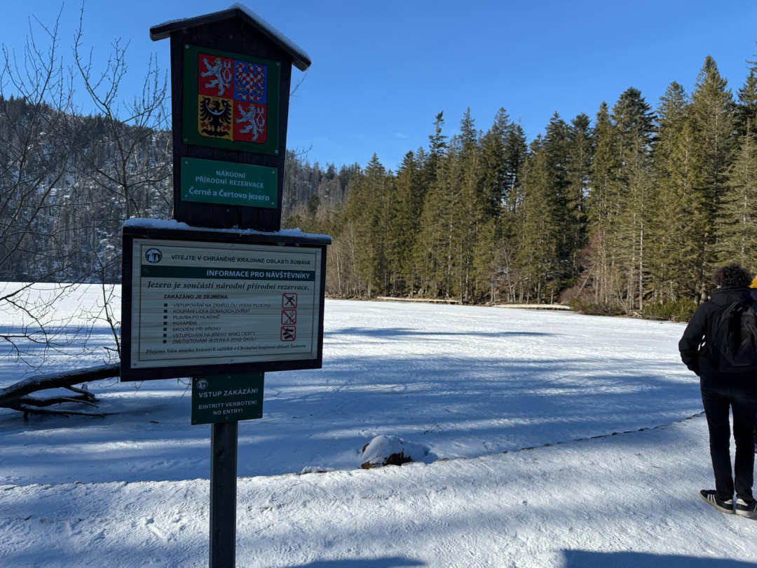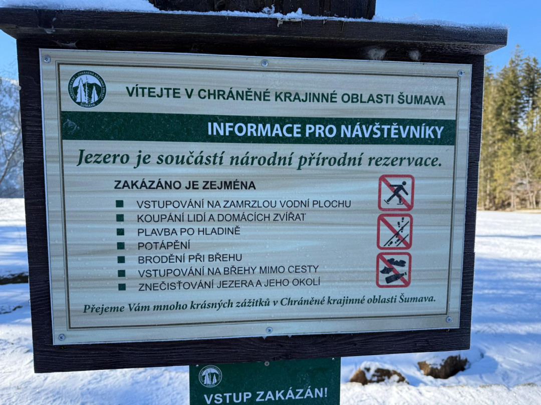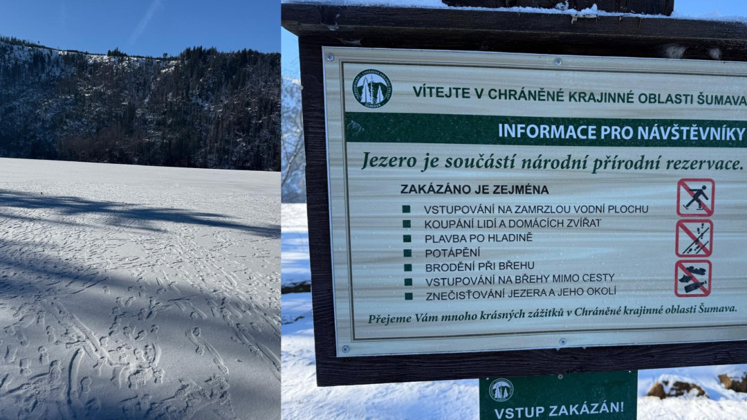 Návštěvníci Šumavy masivně vstupují na plochu zamrzlých jezer. Porušují tak zákon a riskují tučnou pokutu