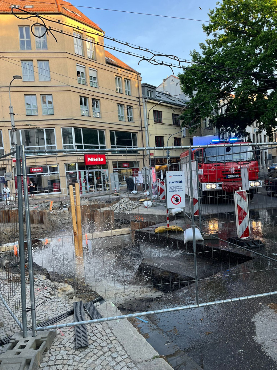 Ve stavebním výkopu prasklo potrubí. Tryskající voda vytopila ulici Na Sadech