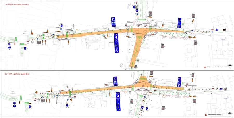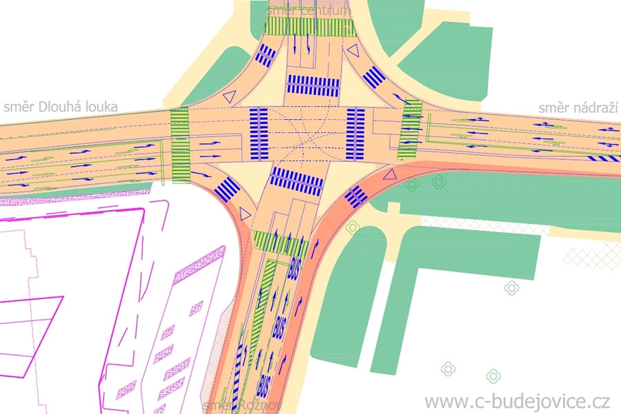 Budoucí podoba křižovatky Mánesova - Lidická s novou organizací dopravy (modře) ve srovnání se stávající (zeleně)