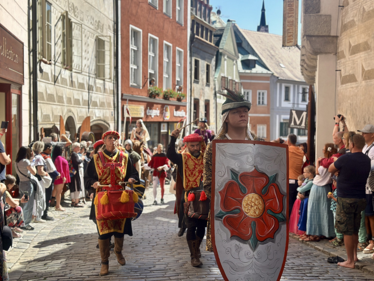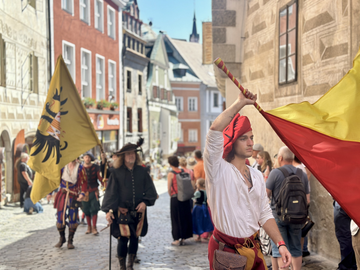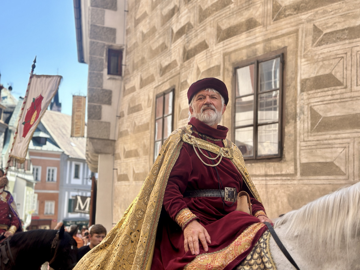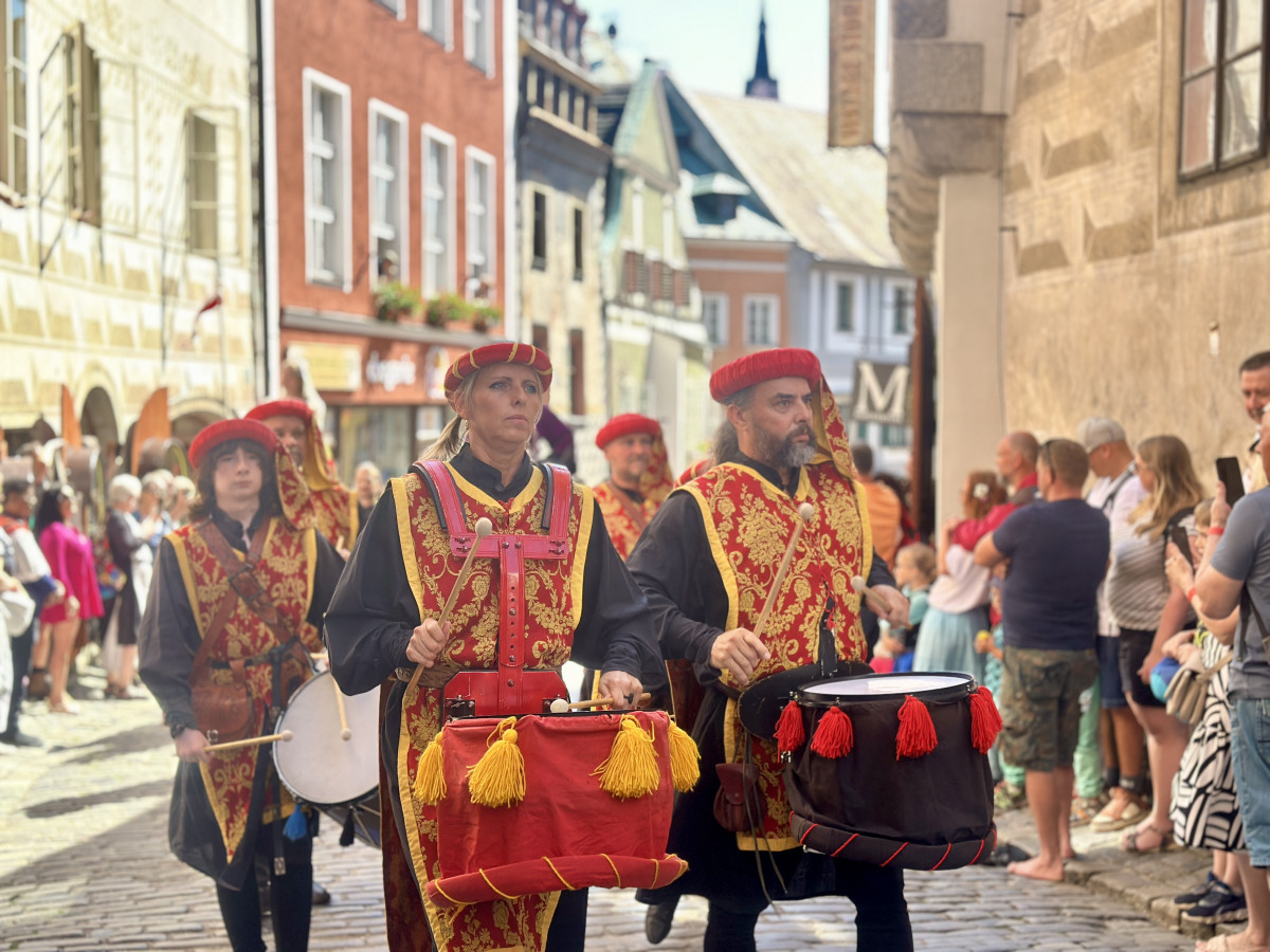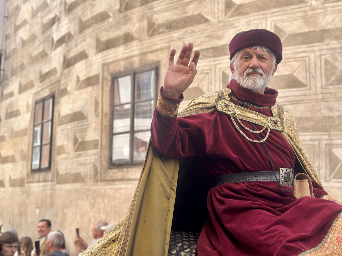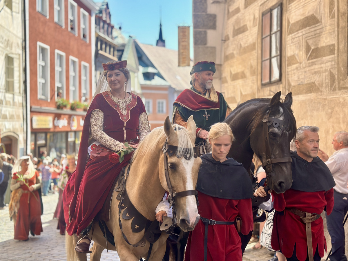 Českým Krumlovem prošel historický průvod. Nechyběli šermíři, kejklíři ani koně s kočáry.