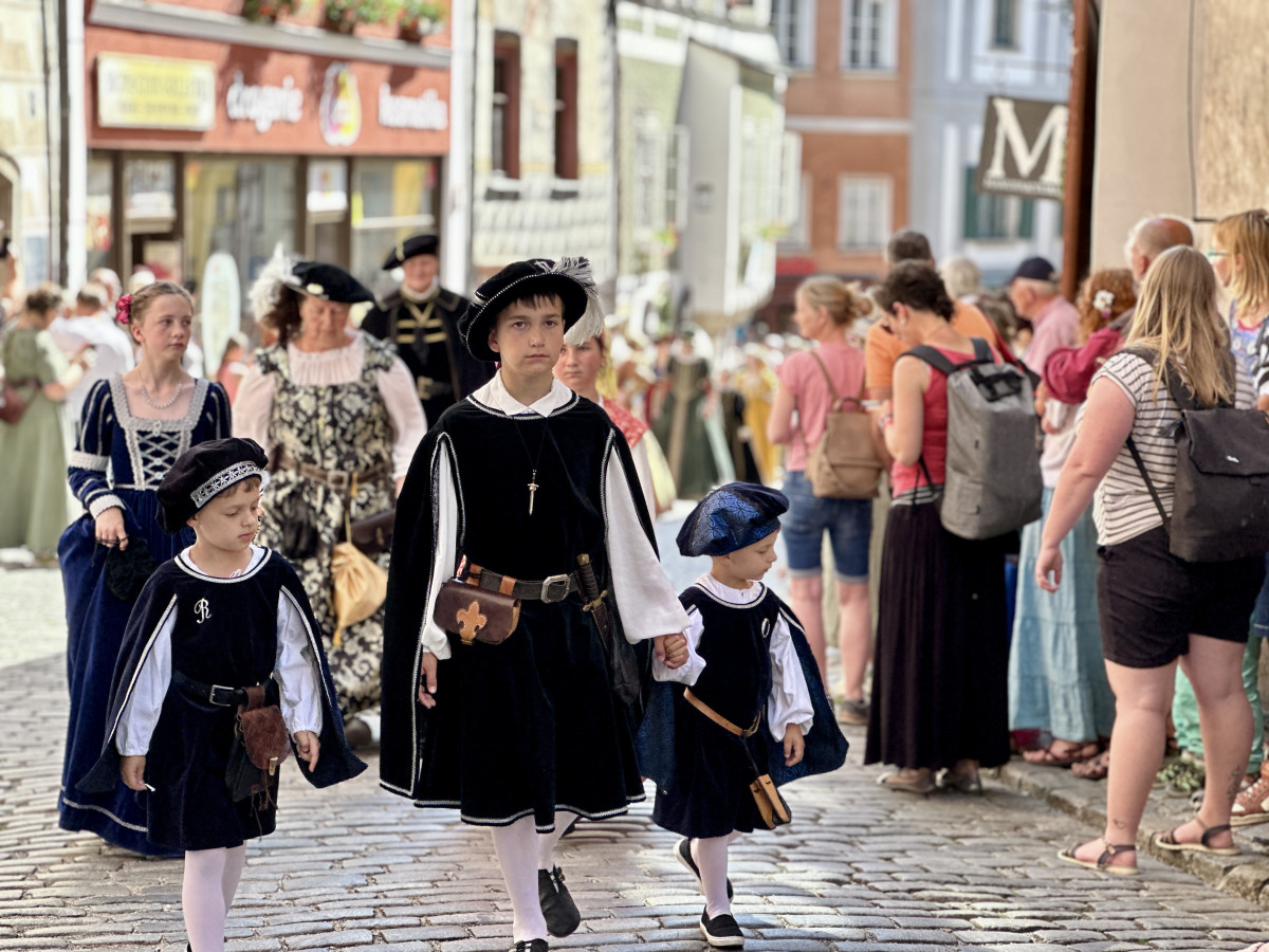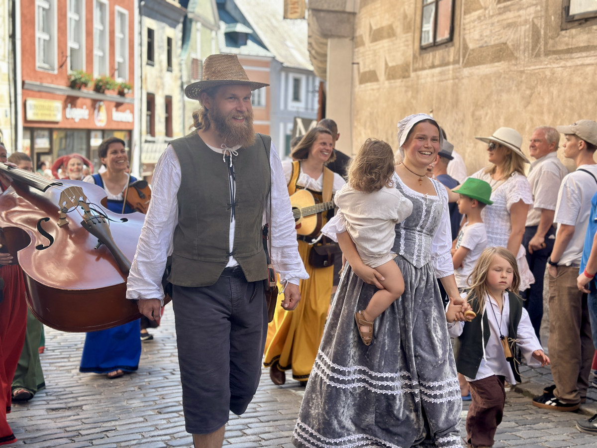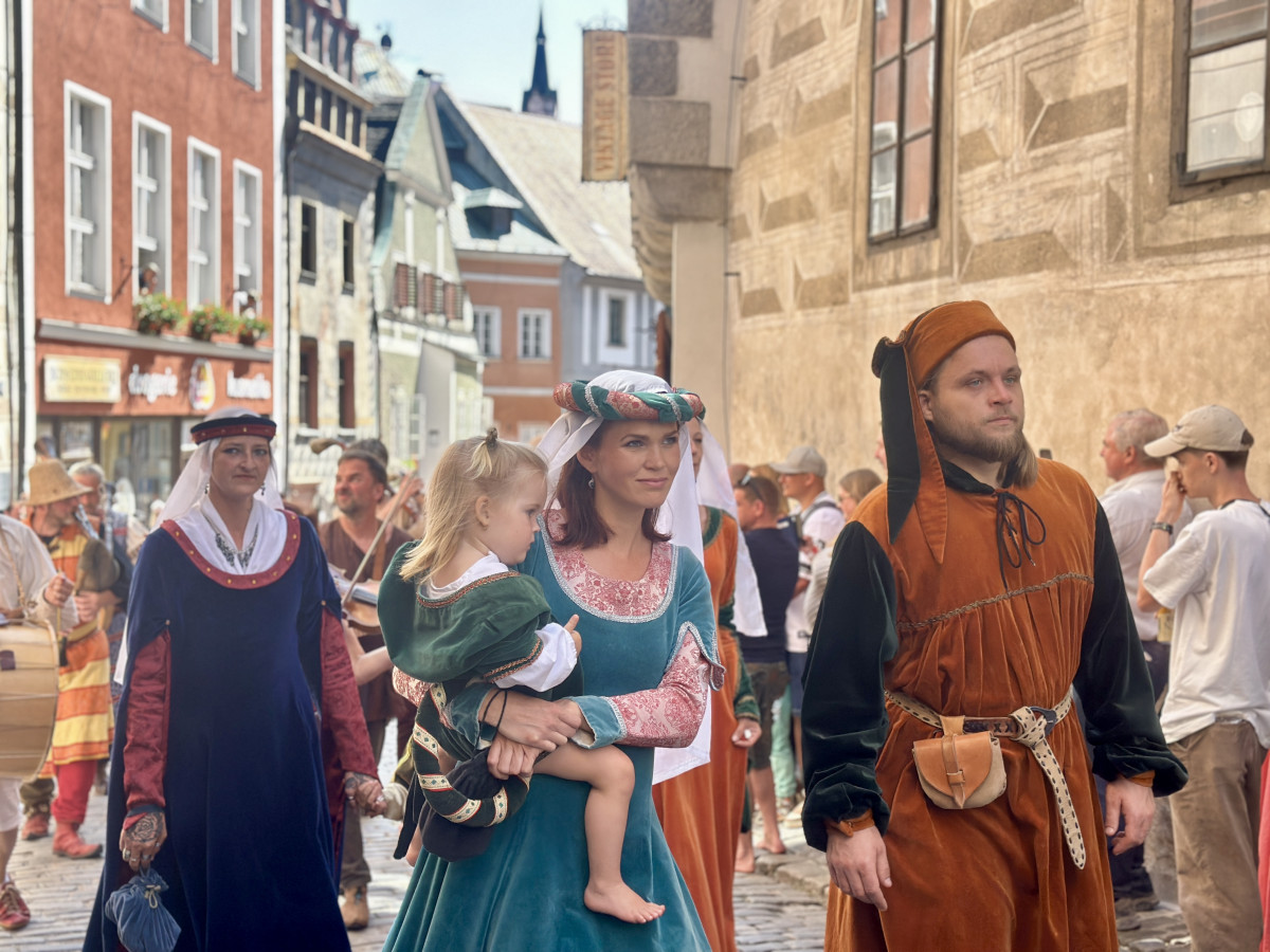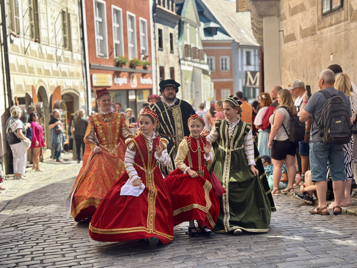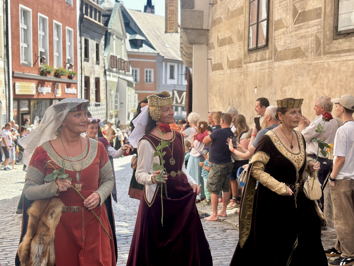 Českým Krumlovem prošel historický průvod. Nechyběli šermíři, kejklíři ani koně s kočáry.