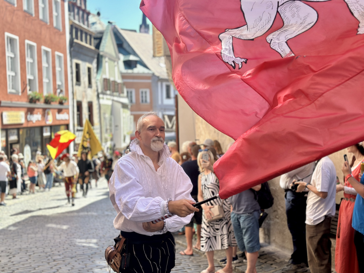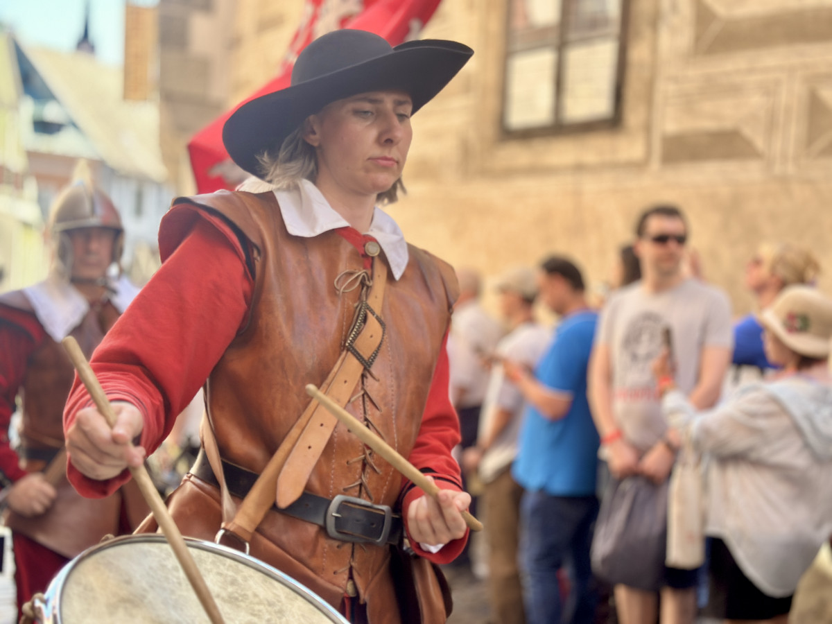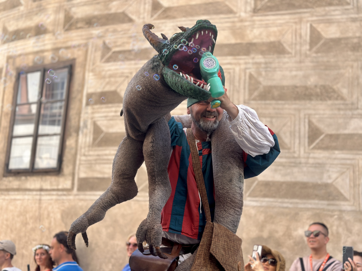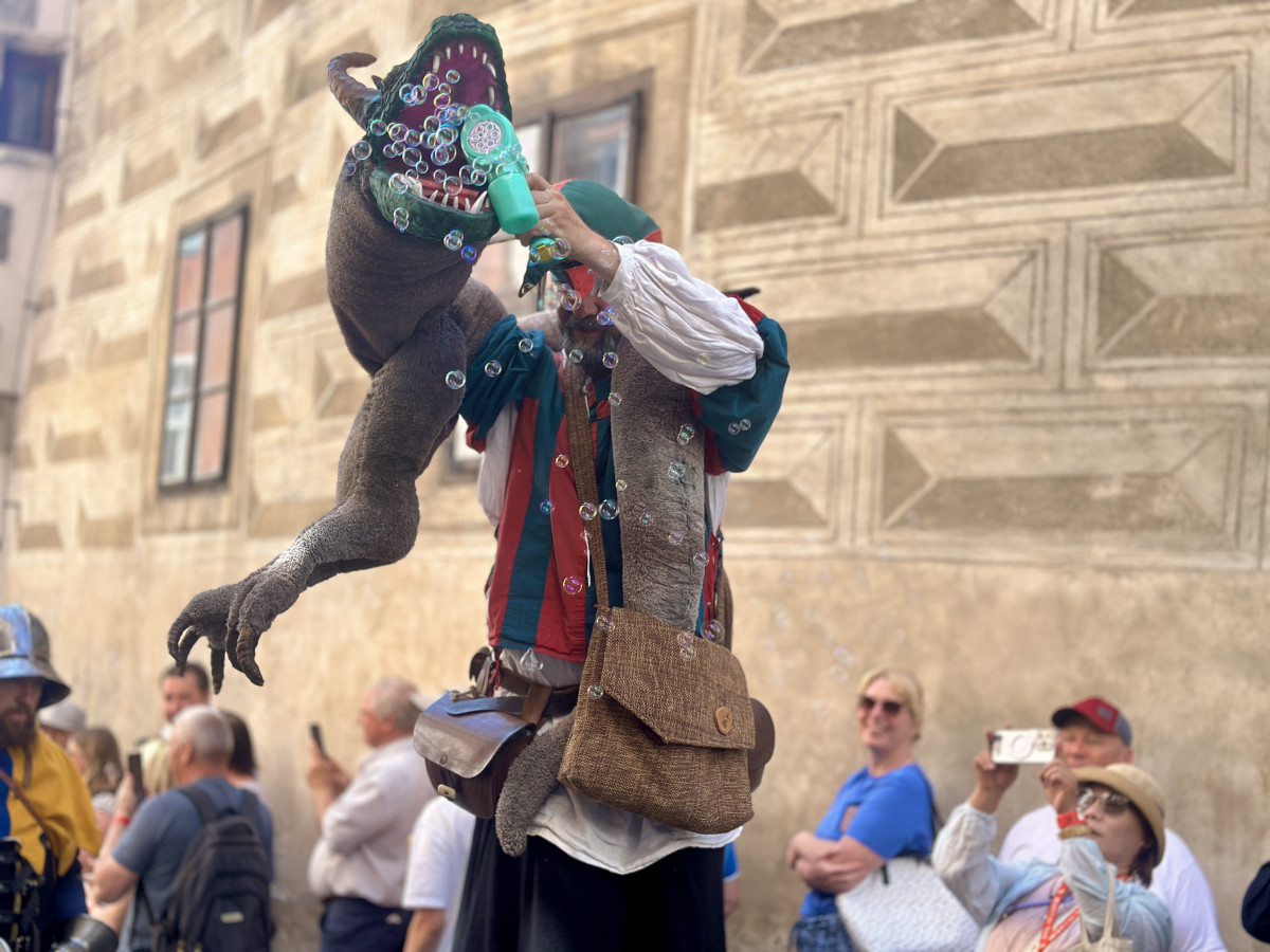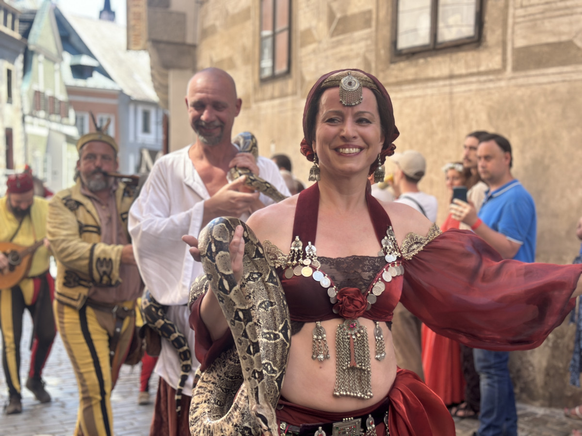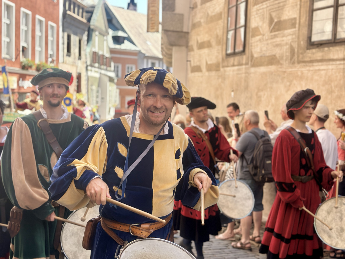 Českým Krumlovem prošel historický průvod. Nechyběli šermíři, kejklíři ani koně s kočáry.