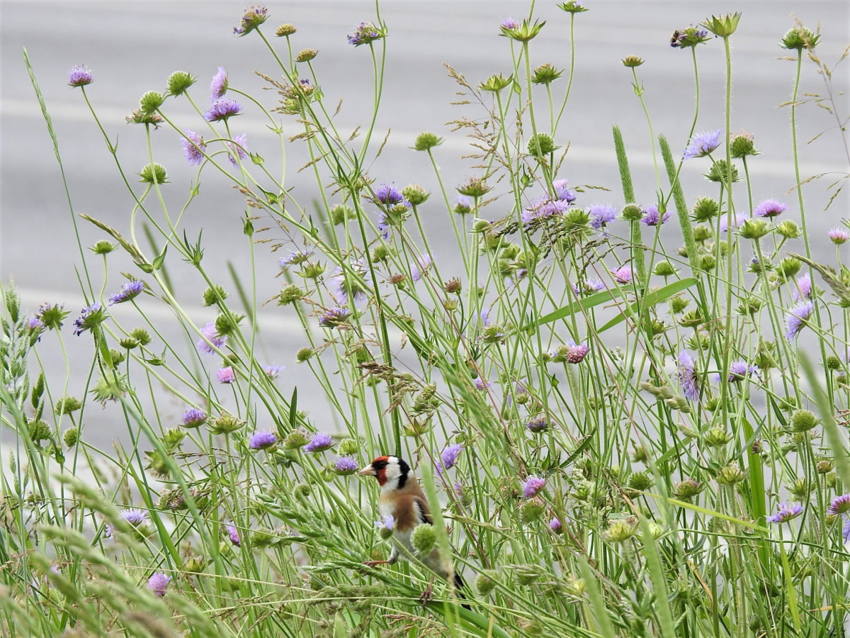 Foto stehlíka, které ukazuje, že porosty chrastavců nevyužívá pouze hmyz