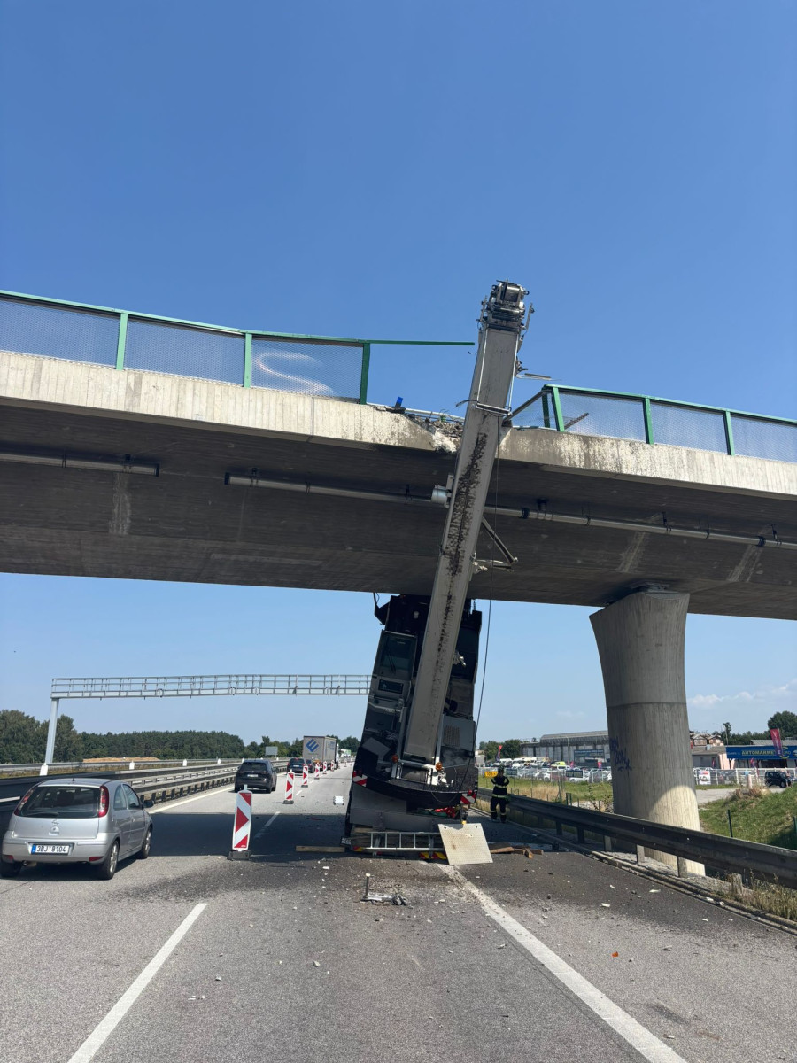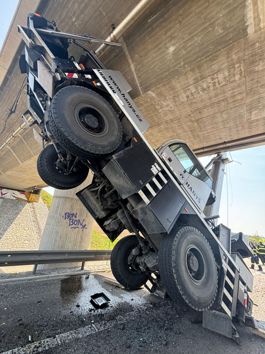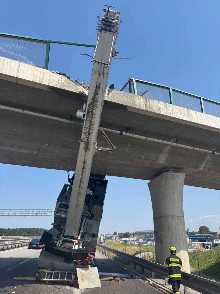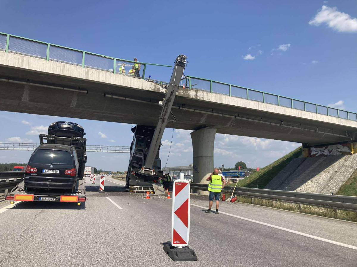 Řidič neodhadl výšku jeřábu a zasekl se pod mostem na dálnici D3