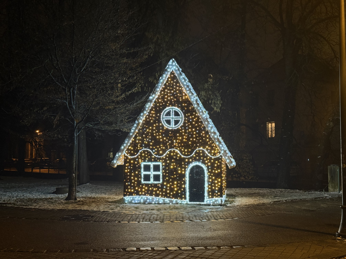 Ulici U Černé věže zdobí vánoční girlandy. Na Sadech vyrostla perníková chaloupka