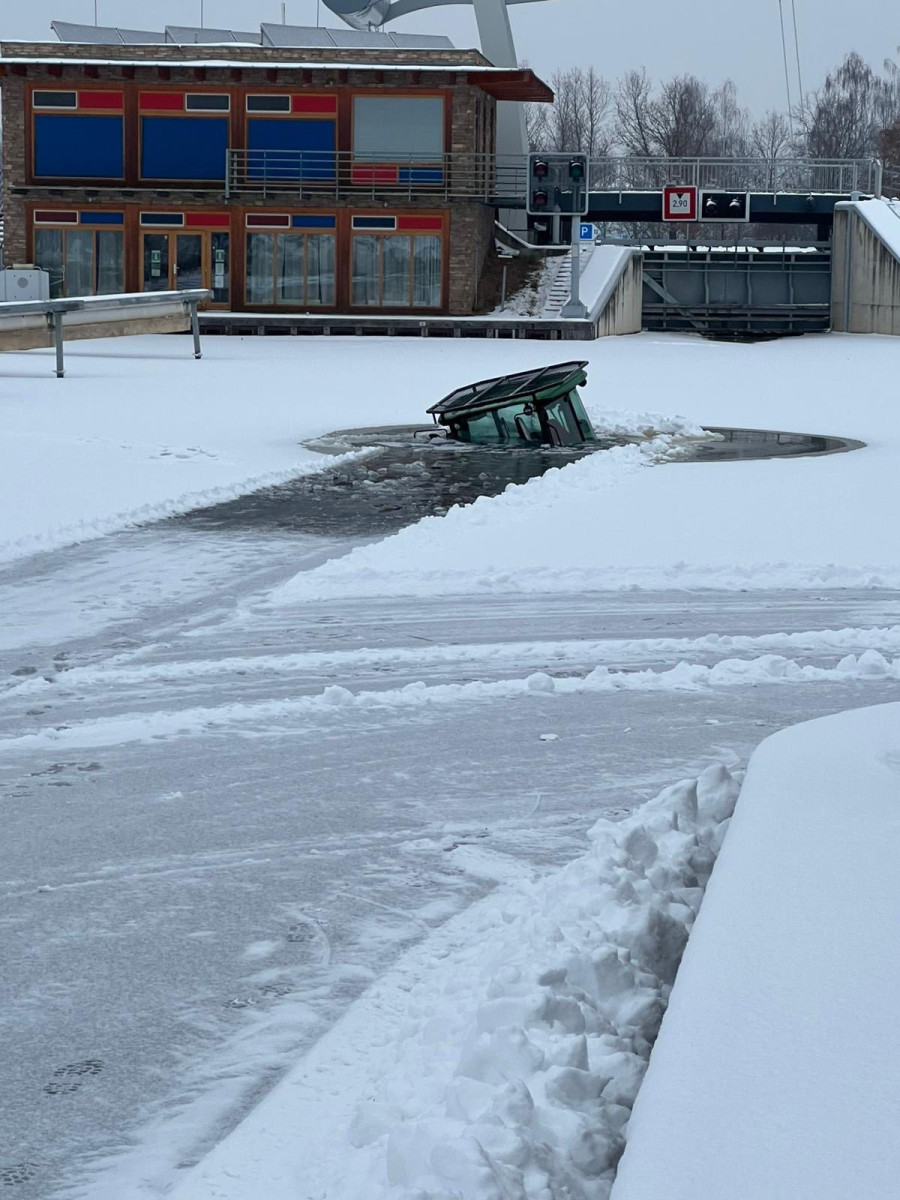 Další těžký stroj pod ledem. V přístavu v Českém Vrbném se propadnul traktor