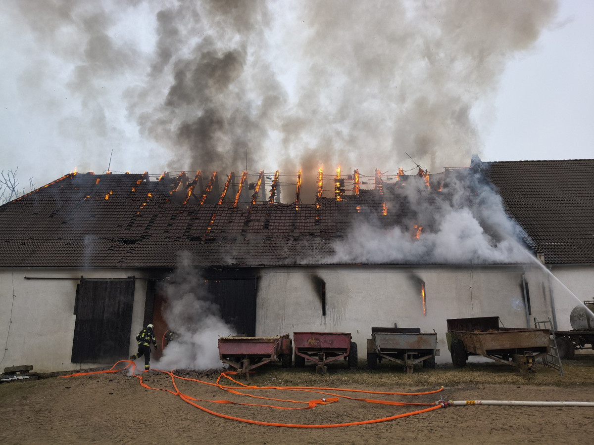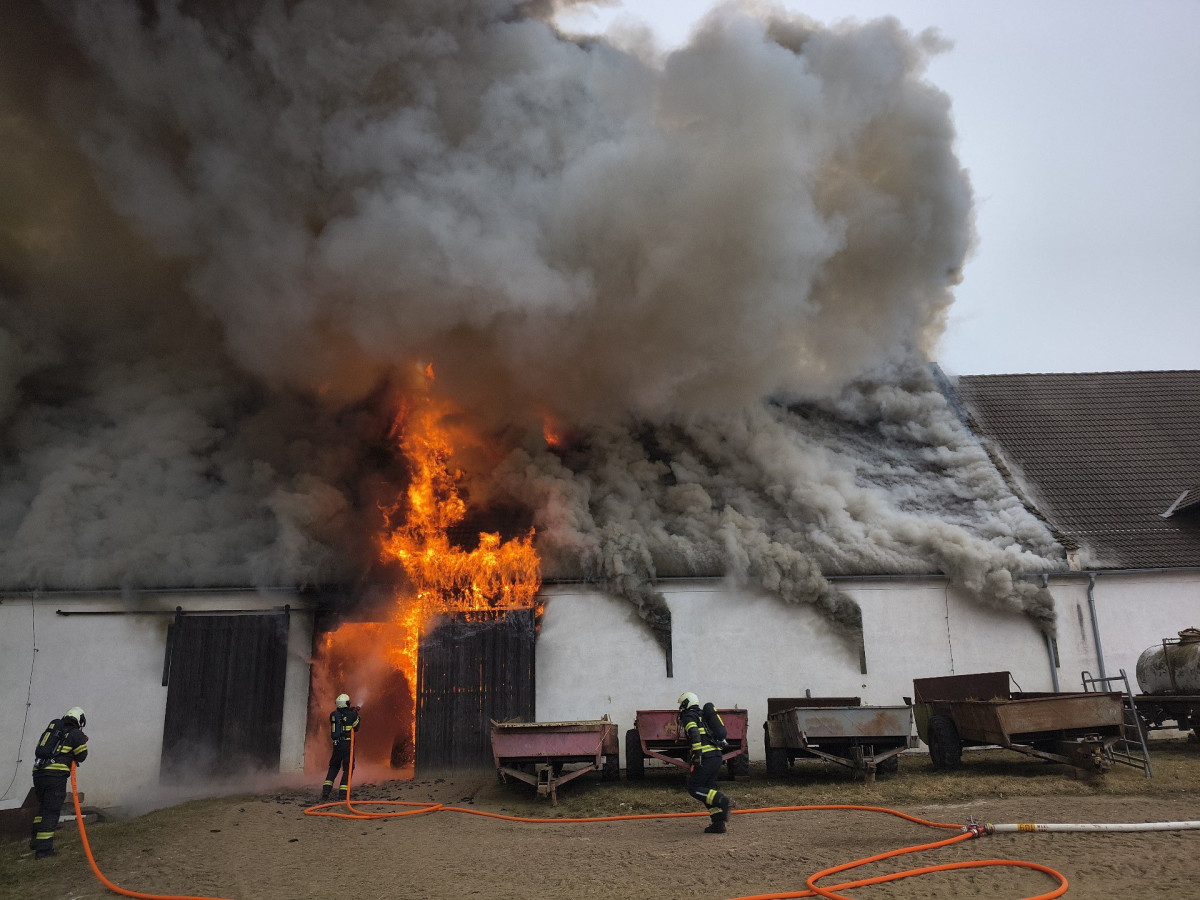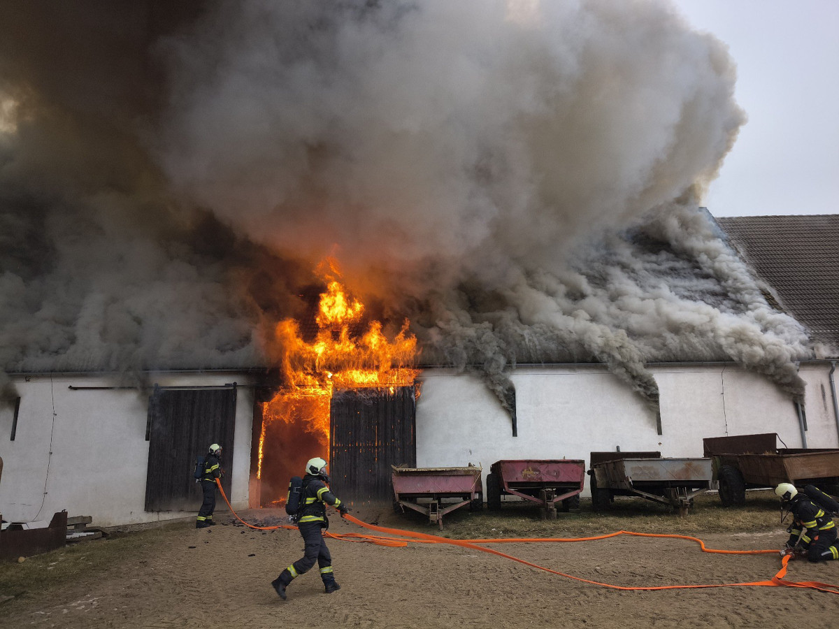 V Hrušově hořela stodola i traktor. Škoda jde do milionů korun.