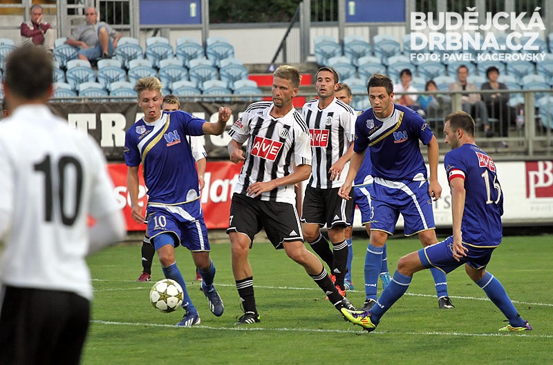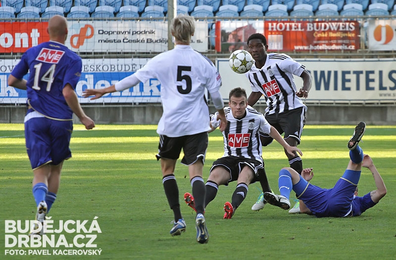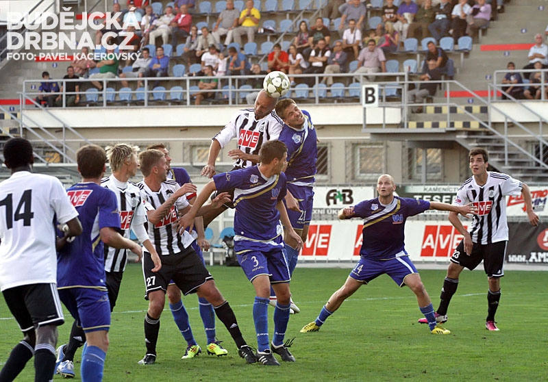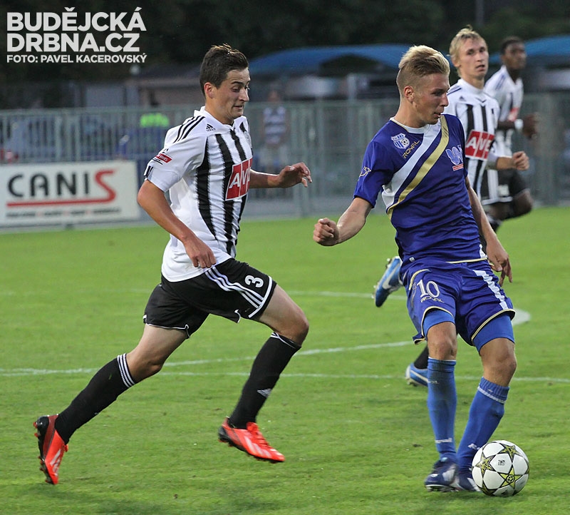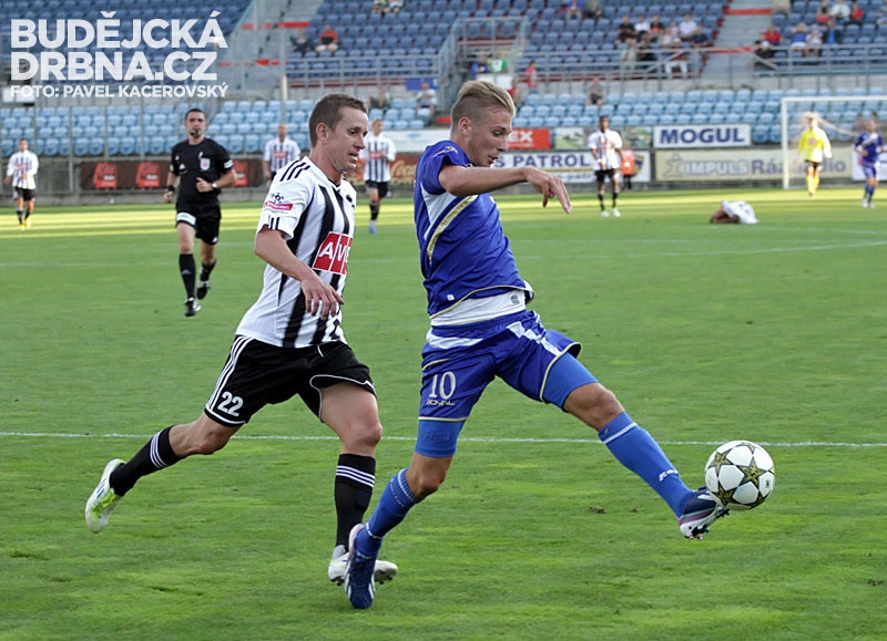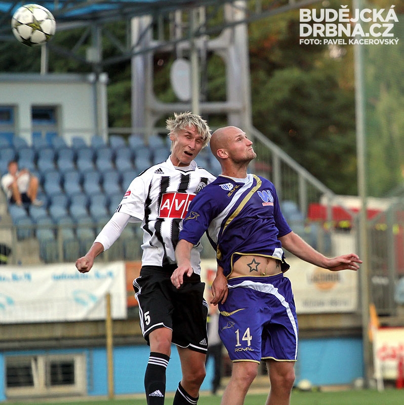 Jan Peterka odkopává míč před Petrem Benátem