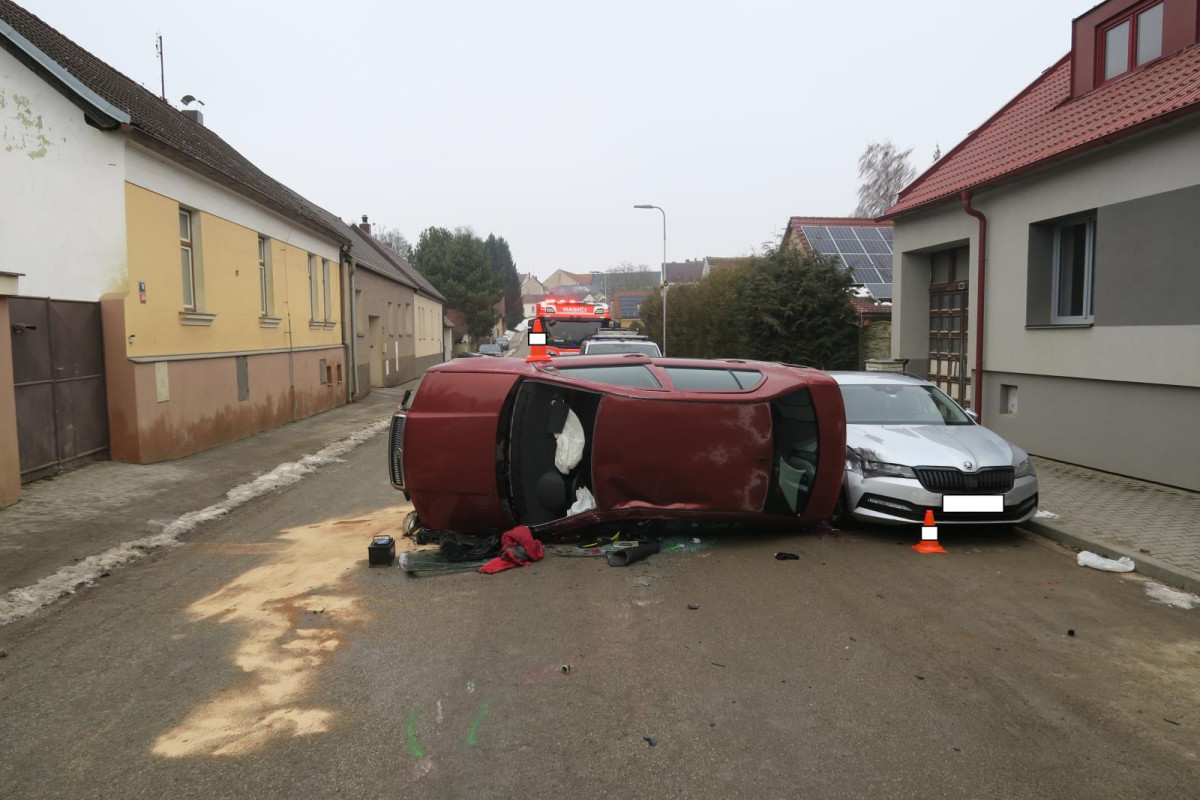 Řidič v Lišově havaroval s více než dvěma promile alkoholu, auto skončilo na boku.