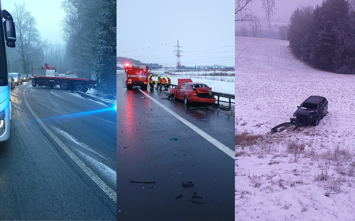 Vydatné sněžení komplikovalo dopravu, autobus u Čížové skončil v příkopě
