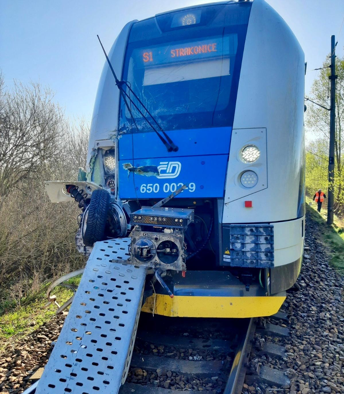 Na přejezdu u obce Skály se střetl vlak s autem, doprava stojí