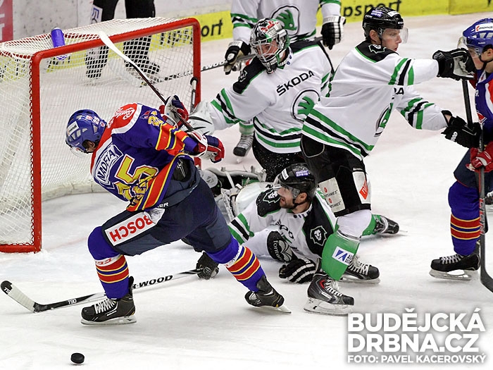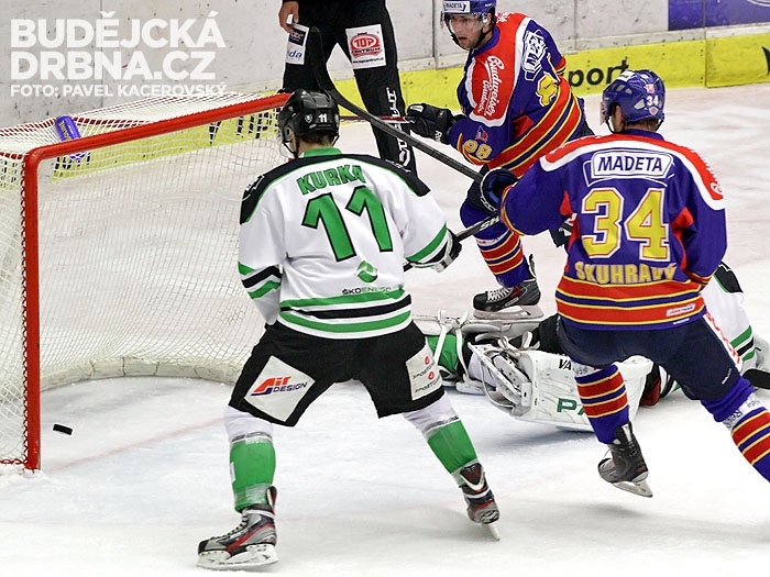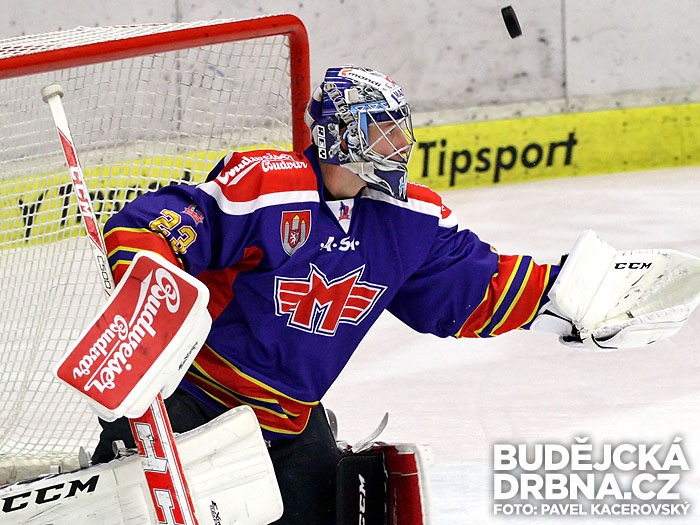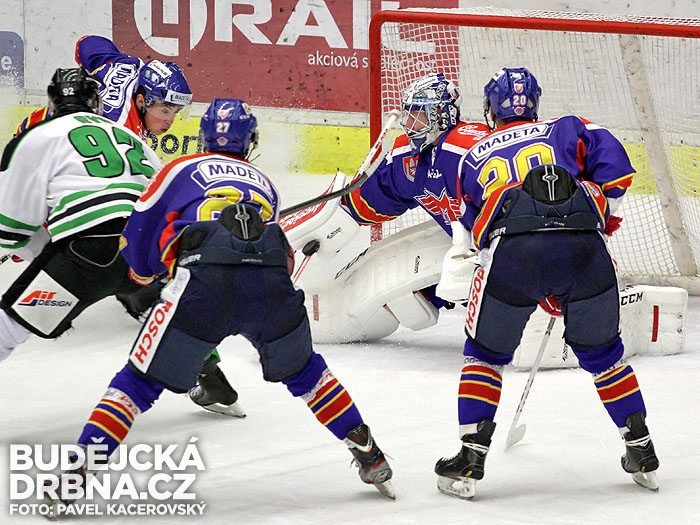 Jeden z těžkých zákroků budějckého gólmana Dominika Halmošiho