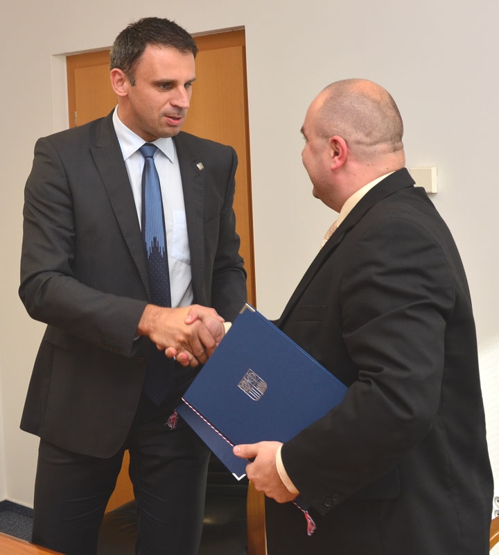 Rektor VŠTE Marek Vochozka a hejtman Jihočeského kraje podepisují Memorandum o spolupráci a podpoře technických oborů na VŠTE v Českých Budějovicích