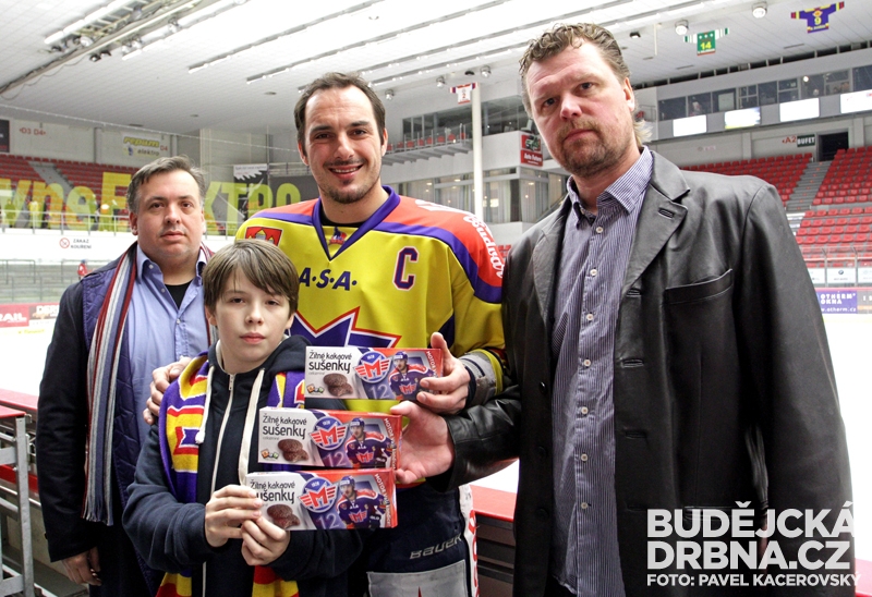 Kapitán Aleš Kotalík, prezident klubu Roman Turek a majitel společnosti REJ společně se svým synem představují nové motorácké sušenky