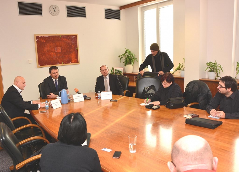 Kromě hejtmana Jiřího Zimoly se setkání s novináři zúčastnili generální ředitel Motor Jikov Group Miroslav Dvořák (vlevo) a generální ředitel Farmtecu Václav Škeřík (vpravo)