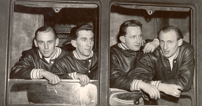 Budějcká zlatá čtyřka se vrací železničním expresem z mistrovství světa ve Stockholmu 1949. Zleva Čeněk Pícha, František Vacovský, František Mizera a Jiří Macelis
